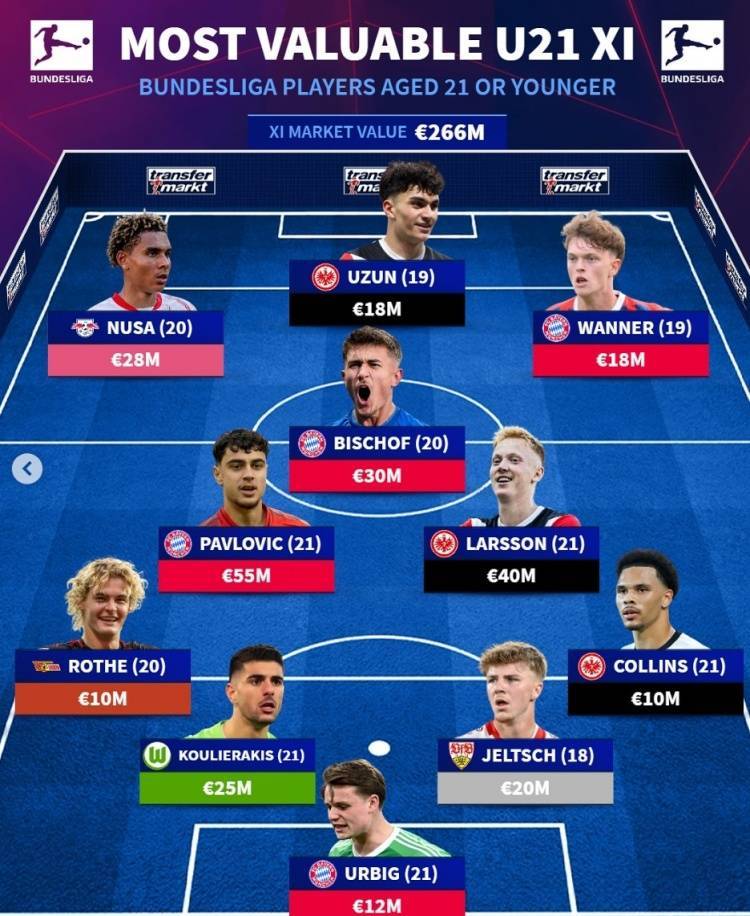 直播吧7月5日讯 《转会市场》统计了德甲U21球员身价最贵阵容,拜仁4将、法兰克福3人在列。德转列德甲U21最贵阵:总身价2.66亿欧元前锋:安东尼奥-努萨(RB莱比锡,2800万)、乌尊(法兰克福,1800万)、万纳尔(拜仁,1...