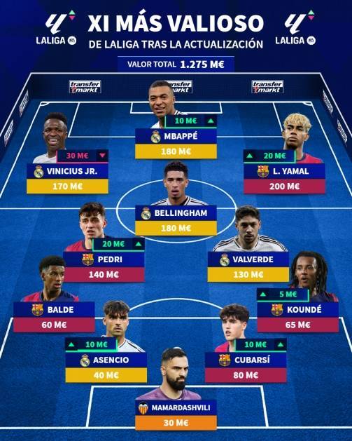 前锋:维尼修斯(皇马,1.7亿、下降3000万)、姆巴佩(皇马,1.8亿、上涨1000万)、亚马尔(巴萨,2亿、上涨2000万)